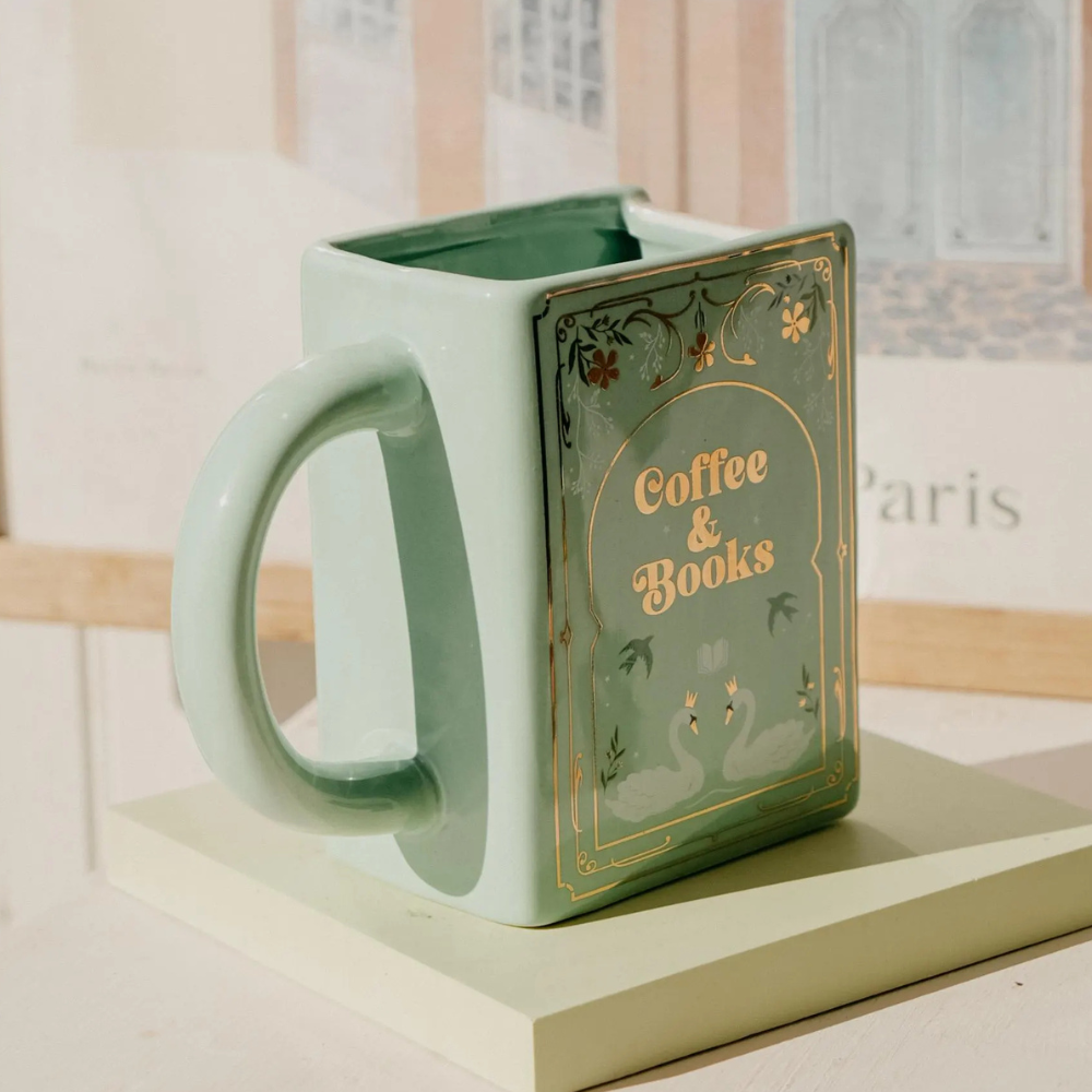 Cosy bookish afternoons made better with a cup of XL coffee. The sage green book shaped coffee mug features a fairytale style design.